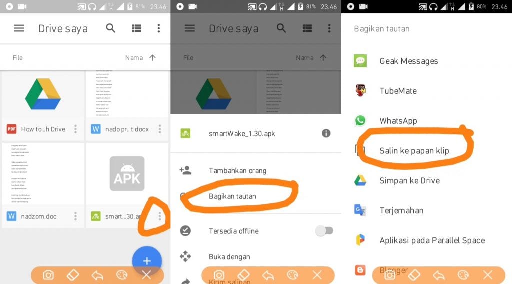 8. Untuk mengetahui link-nya. tap titik tiga pada file tadi – Bagikan tautan – Copy (Salin ke papan klip).