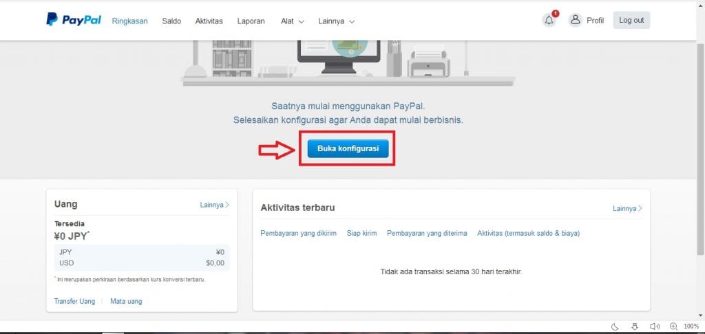 Masuk atau log-in ke akun paypal yang ingin di verifikasi, kemudian klik tulisan “buka konfigurasi”.