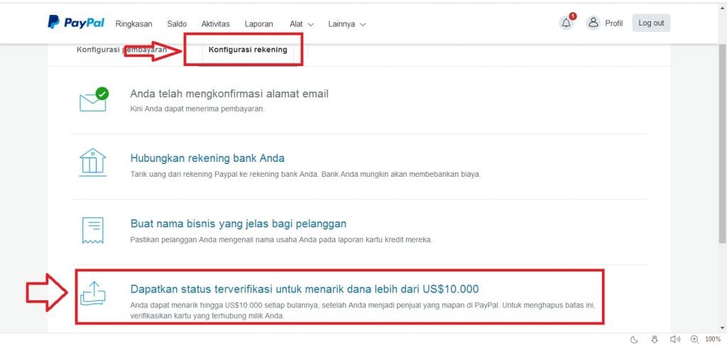 Pilih konfigurasi rekening, kemudian pilih tulisan ” dapatkan status terverifikasi untuk menarik dana lebih dari US $10.000″.