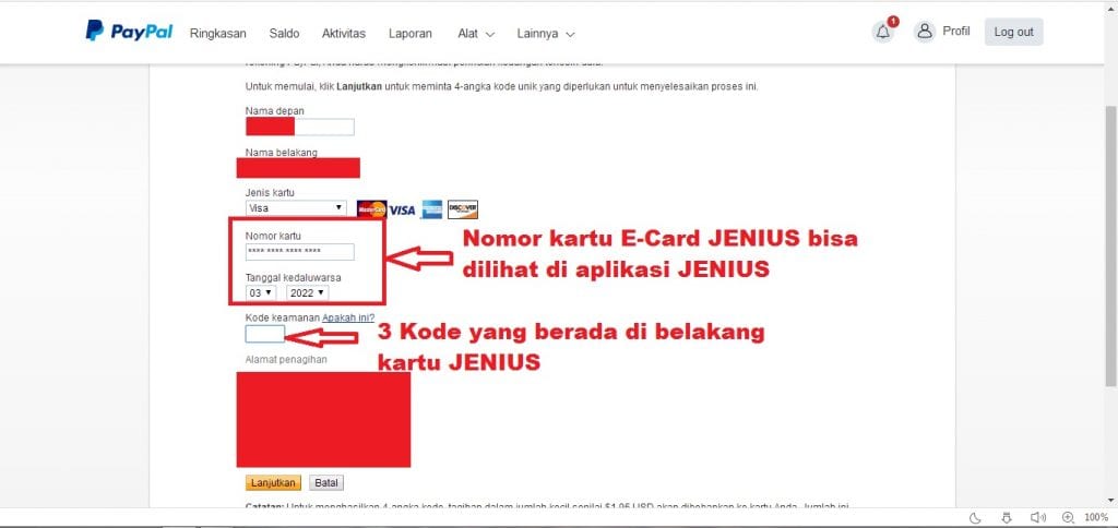 untuk mengisi data-data diatas buka aplikasi JENIUS kita, sebelumnya isi kartu E-card JENIUS kita dengan cara top-up dari saldo M-CARD (agar saldo terisi gratis sebesar Rp. 50.000 saat pendaftaran JENIUS akan ditanyakan ajakan teman isi dengan $tedz, saldo tersebut bisa kita top-up ke kartu E-Card) karena proses verifikasi paypal akan dikenakan biaya sebesar $1,95 USD atau Rp. 26.000 oleh pihak paypal, dan otomatis akan diambil dari kartu E-Card yang kita daftarkan.