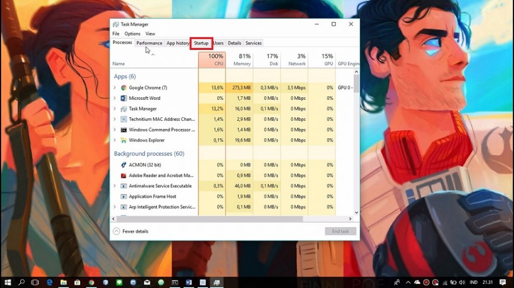 4. Disini akan ditampilkan lebih detail aplikasi yang berjalan. Mulai dari penggunaan cpu, memory, disk, network, dan gpu. Pilih tab startup untuk pengaturan startup aplikasi