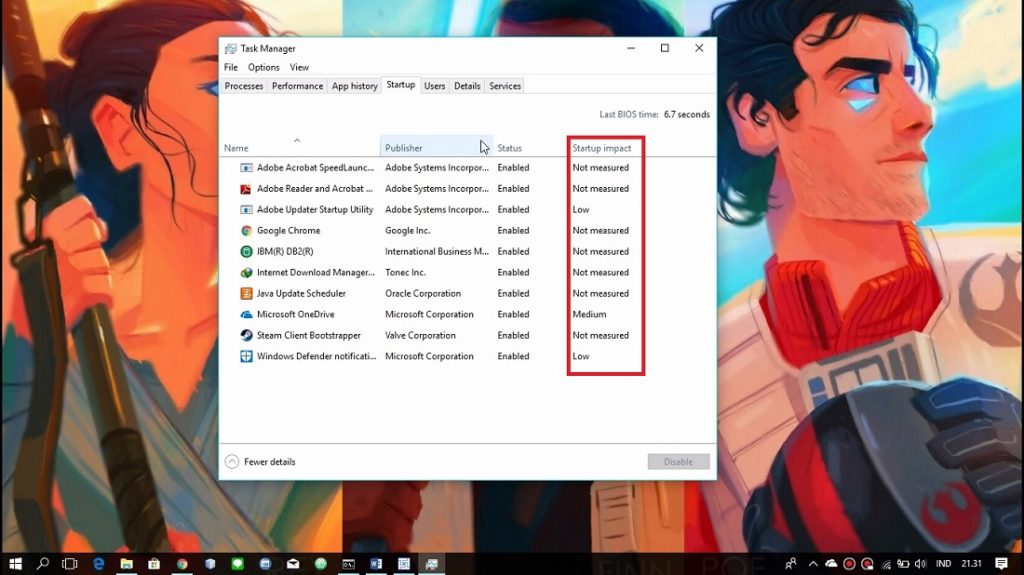 - Kolom status impact berisi tentang informasi tentang seberapa besar pengaruh aplikasi tersebut terhadap komputer saat berjalan otomatis. Ada beberepa tingkatan, yaitu not measured, low, medium, dan high. Semakin tinggi status impact, maka semakin besar pengaruh terhadap sistem. Jika statusnya high, lebih baik di matikan startupnya, karena sangat membebani sistem.