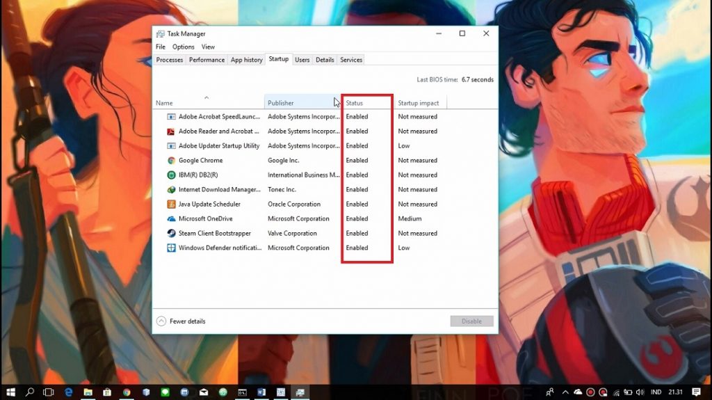 - Status merupakan status aplikasi tersebut, apakah fitur auto startupnya aktif atau tidak. Jika disable maka tidak aktif, jika enable berarti aktif.