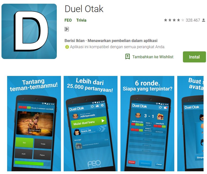 Game duel otak ini sangat populer di kalangan pencinta game yang hobi bermain game seperti ini, game ini sangat ringan untuk dimainkan di smartphone yang memiliki RAM hanya 1Gb. Selain itu kamu juga bisa bermain game ini dengan teman, pacar ataupun rekan kerja.