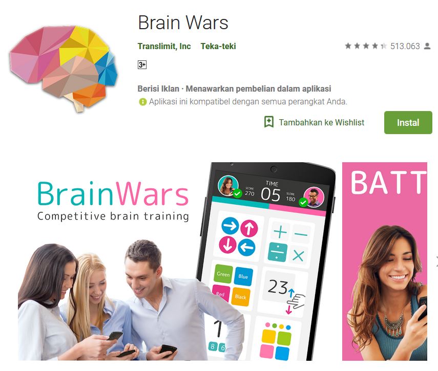 Selanjutnya game asah otak berikutnya adalah Brain Wars. Game ini sebenarnya hampir sama dengan duel otak, dia memiliki soal-soal yang begitu sulit dan memecahkan logika soal matematika.