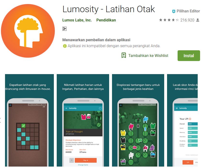 Lumosity – Latihan Otak adalah game untuk mencerdaskan otak seseorang, dimana para user dilatih untuk mengingat. Karena di game ini daya ingat sangat diperlukan, karena misi-misinya bermain dengan mengingat.