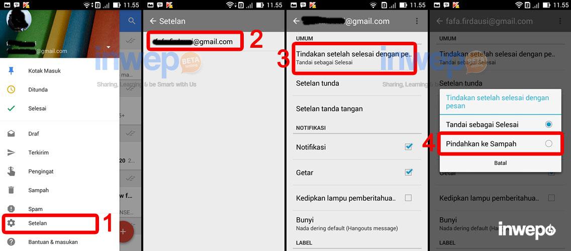 Buka aplikasi Inbox by Gmail –  Settings – Ketuk akun e-mail – Ketuk menu action when done with message – ketuk tombol move to trash.