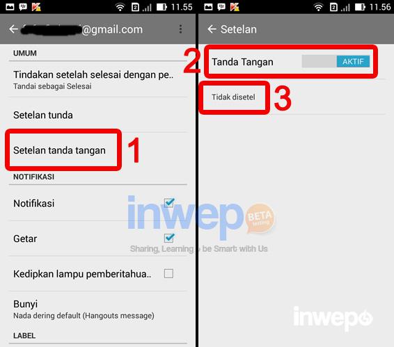 Buka menu Settings – Ketuk akun e-mail – ketuk menu signature – Geser tombol setelan mati menjadi aktif – Ketuk menu dibawahnya untuk menuliskan isi tanda tangan.