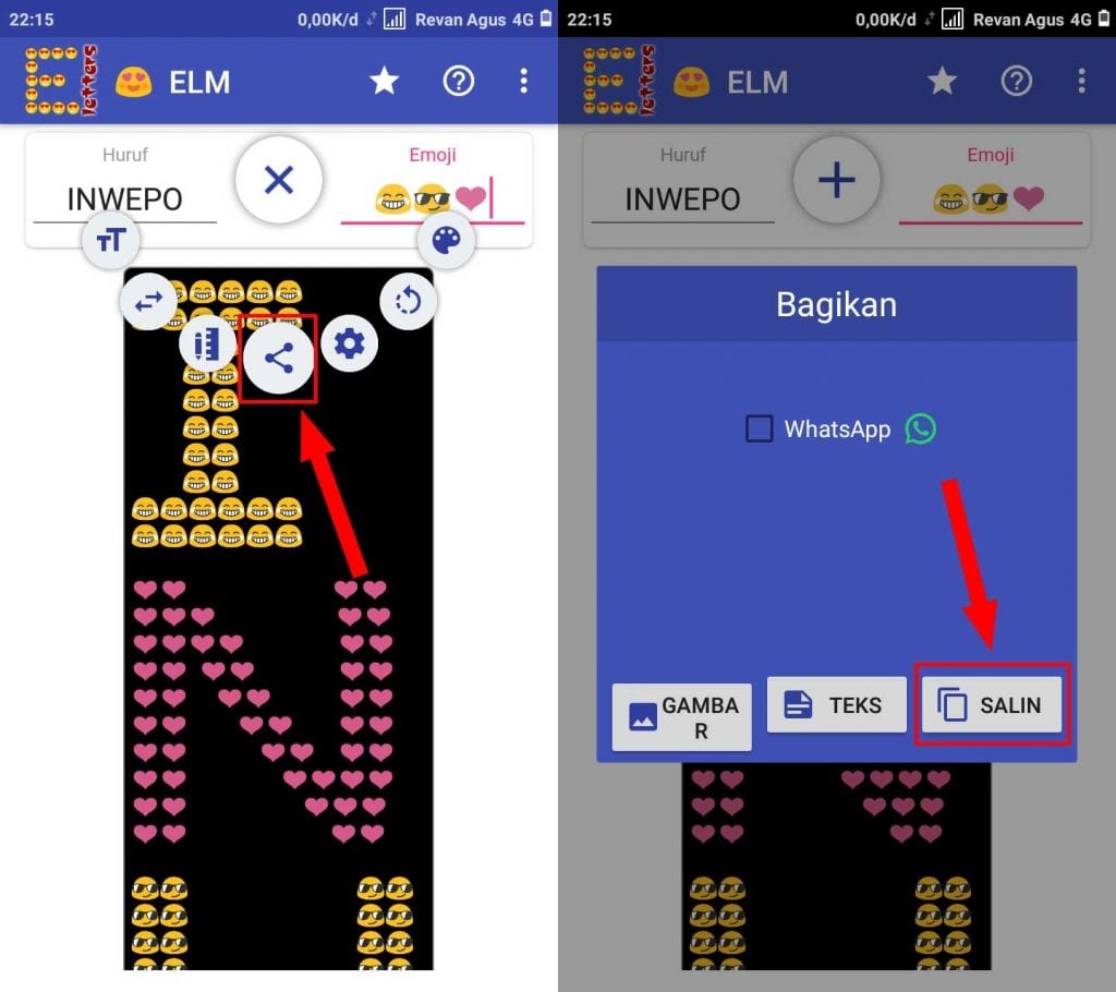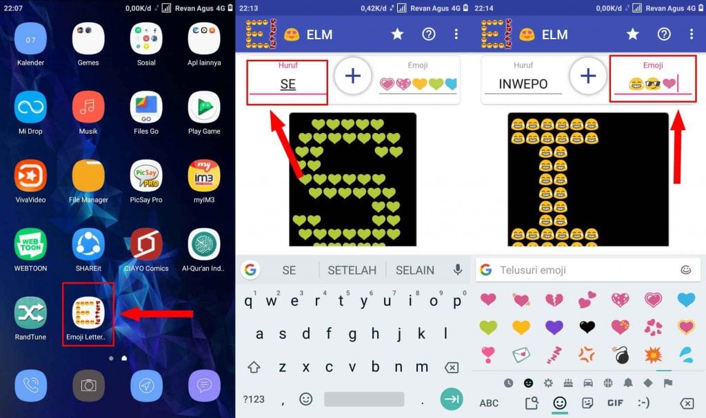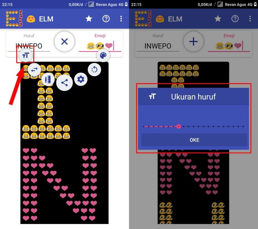 Langkah kedua, setelah terinstall buka aplikasi Emoji Letter Maker. Hapus huruf default yang ada kemudian ganti dengan kata atau kalimat yang kamu inginkan. Begitu sebaliknya hapus juga Emoji dan ganti sesuai yang di inginkan.