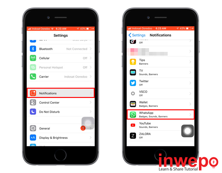 1. Masuk Pengaturan – Ketuk Notifications – Gulir ke bawah ketuk WhatsApp.