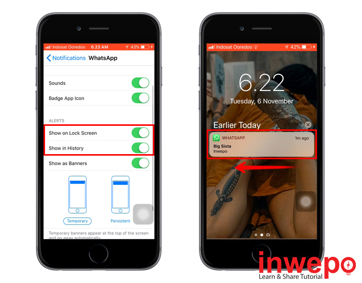 2. Aktifkan Show On Lock Screen & Show in History – Pada saat pesan WhatsApp masuk, saat iPhone terkunci geser pesan WhatssApp yang ingin kamu balas.