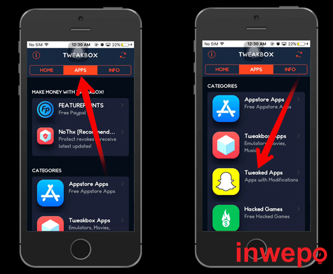 3. Buka aplikasi Tweakbox – pilih APPS – pilih Tweaked Apps.