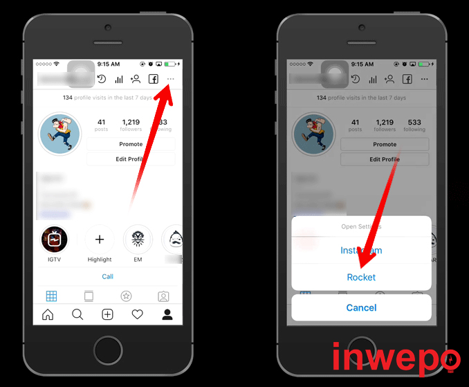 5. Buka Instagram – pergi ke profil Instagram kamu – Tap ikon … (titik tiga) di kanan atas – pilih Rocket
