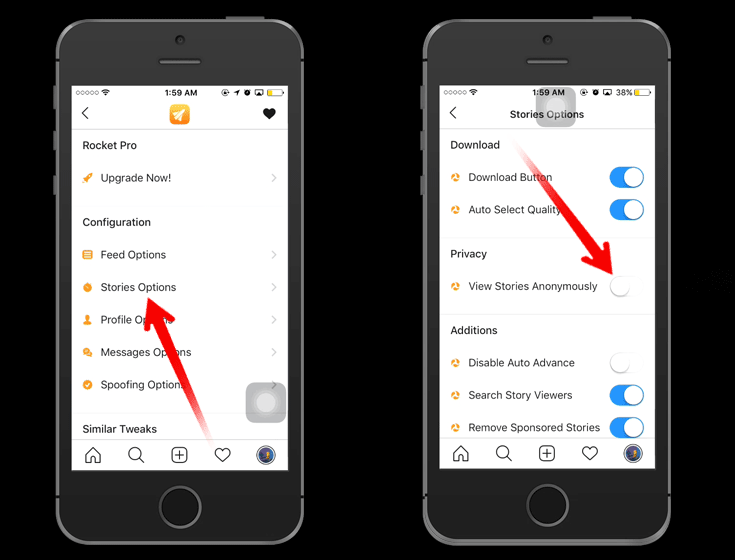 5. Buka 1 Instagram Rocket – pergi ke profil Instagram kamu – Tap ikon … (titik tiga) di kanan atas – masuk ke configuration – pilih stories option – aktifkan view stories anonymously