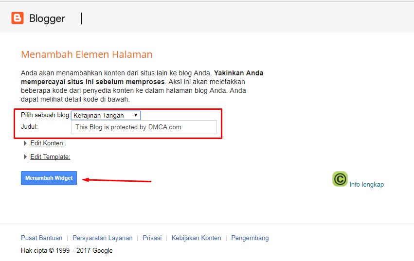 5. Selanjutnya ada tampilan konfirmasi dari pihak Blogger, pilih blog kamu. Judul bisa ditulis DMCA Protection atau tidak diisi bila hanya ingin menampilkan gambar saja. Lalu klik Menambah Widget.