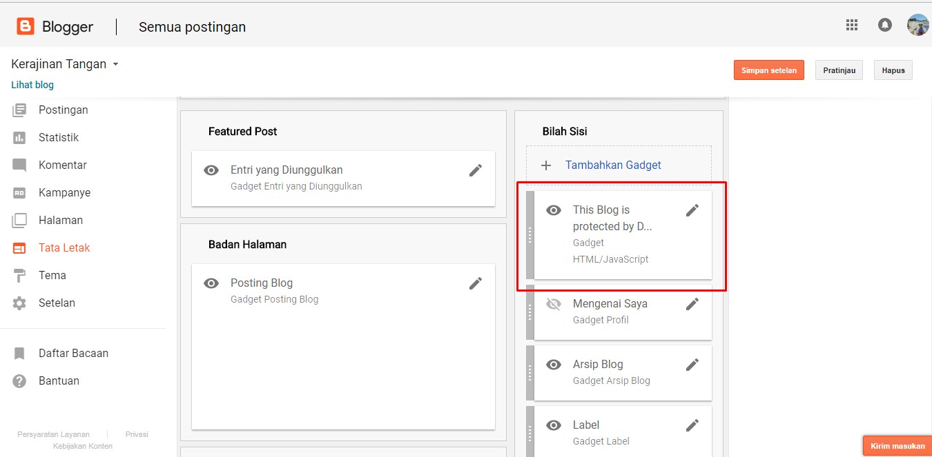 6. Kemudian kamu akan dibawa ke Tata Letak, tempatkan sesuai keinginan. Simpan dan lihat blog kamu.