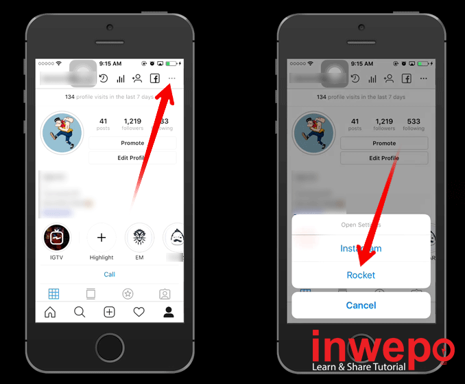 5. Buka Instagram – pergi ke profil Instagram kamu – Tap ikon … (titik tiga) di kanan atas – pilih Rocket.