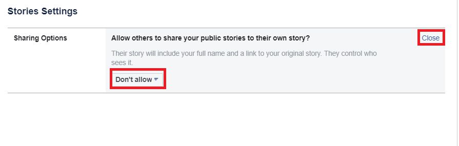 3. Kamu ubah opsi pengaturan privasi Facebook Stories kamu menjadi Don’t allow seperti gambar di bawah ini, lalu kamu klik teks Close.