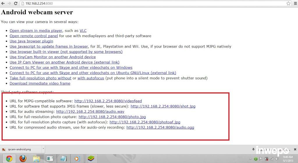 3. buka IP address dan port sesuai yang tertera di aplikasi IP Webcam.