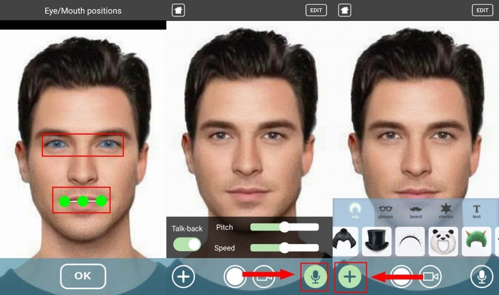 Selanjutnya tap pada icon mikrofon atur kecepatan suara dan pitch untuk suara di foto kamu nantinya. Kamu juga bisa menambahkan aksesori lain seperti topi, rambut, atau kacamata dengan memilih icon plus di samping kiri.