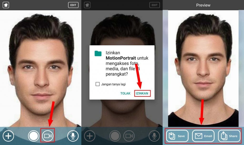 Langkah keempat, tap icon video nanti akan muncul notif pilih IZINKAN. Kemudian perekaman akan dimulai jangan lupa untuk mengucapkan kata apa saja selama perekaman untuk mengisi suara di foto yang sedang kamu buat. Terakhir tap Save untuk menyimpannya atau pilih Email untuk mengirimnya lewat email ke teman kamu dan bisa juga langsung pilih tombol Share untuk menggirimnya ke akun media sosial kamu.