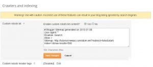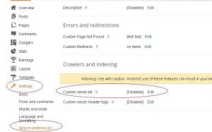 3. Masuk ke halaman menu blogger pilih Setting, Search Preferences , Edit Custom Robot.txt, Pilih Yes untuk Enable Custom Robot.txt Content