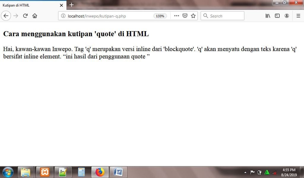 <!DOCTYPE html> <html> <head> <title>Kutipan di HTML</title> </head> <body> <h3>Cara menggunakan kutipan 'quote' di HTML</h3> <p>Hai, kawan-kawan Inwepo. Tag 'q' merupakan versi inline dari 'blockquote'. 'q' akan menyatu dengan teks karena 'q' bersifat inline element. <q>ini hasil dari penggunaan quote </q> </body> </html>