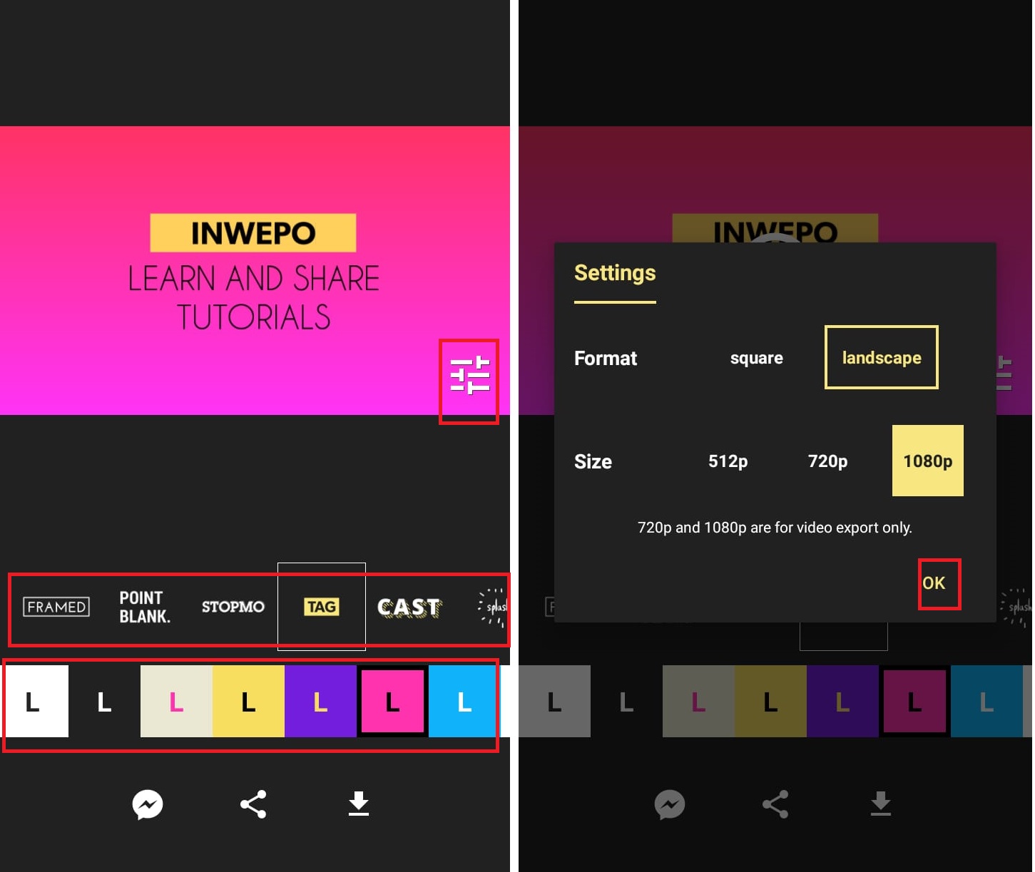 5. Untuk mengatur kualitas video – Tap setting – Tap format Landscape/square – Tap Size 1080p – OK