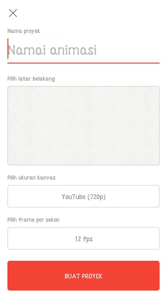2. Tap ikon lingkaran merah untuk membuat animasi – lalu kamu akan dihadapkan pada pengaturan animasi yang akan kamu buat, seperti latar belakang, ukuran kanvas atau kualitas video animasi yang akan dibuat, frame per detik (semakin besar nilai fps yang kamu pilih maka semakin halus gerakan animasi tapi semakin banyak pula frame yang dibutuhkan untuk menghasilkan durasi per detiknya) – Tap Buat proyek setelah menyelesaikan pengaturan.