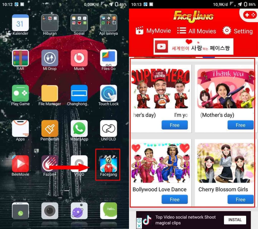 2. Buka aplikasi Facejjang kemudian pilih template video yang akan digunakan.