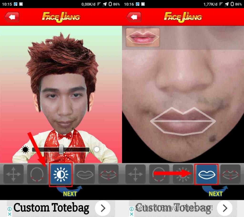 6. Tap icon matahari untuk mengatur pencahayaan dari wajah kemudian tap garis bibir dan atur agar pas di bibir.