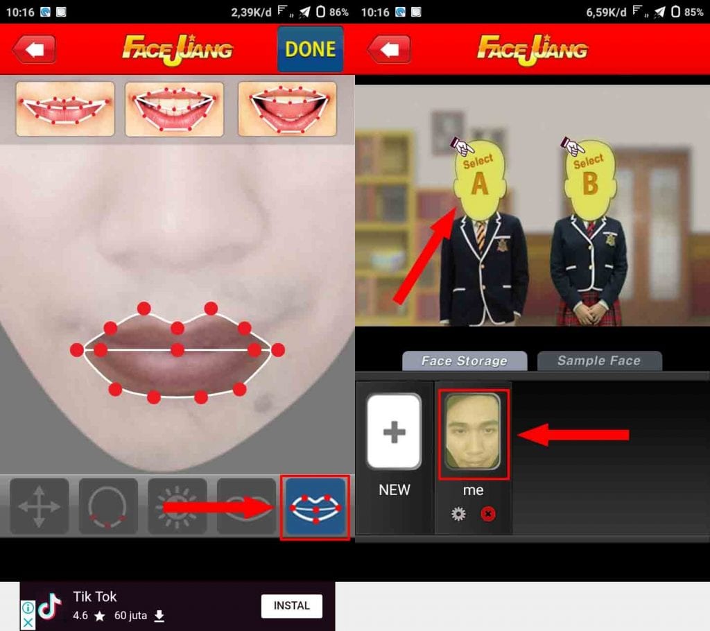 7. Luruskan bibir menggunakan titik-titik bantu, jika sudah tap DONE. Tap pada wajah yang selesai dibuat tadi lalu masukkan pada karakter A atau B.