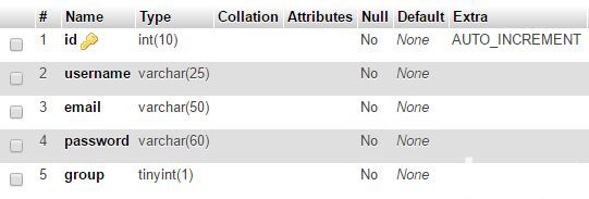 CREATE TABLE `users` ( `id` int(10) NOT NULL, `username` varchar(25) NOT NULL, `email` varchar(50) NOT NULL, `password` varchar(60) NOT NULL, `group` tinyint(1) NOT NULL ) ENGINE=InnoDB DEFAULT CHARSET=latin1; ALTER TABLE `users` ADD PRIMARY KEY (`id`);
