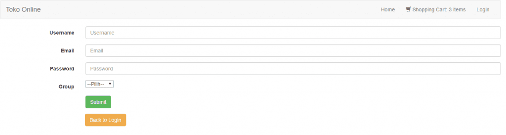 Nah, untuk melihat tampilan dari menu register ini, pembaca dapat mengetikan URL http://localhost/toko-online/index.php/regis. Berikut ini tampilan dari register: