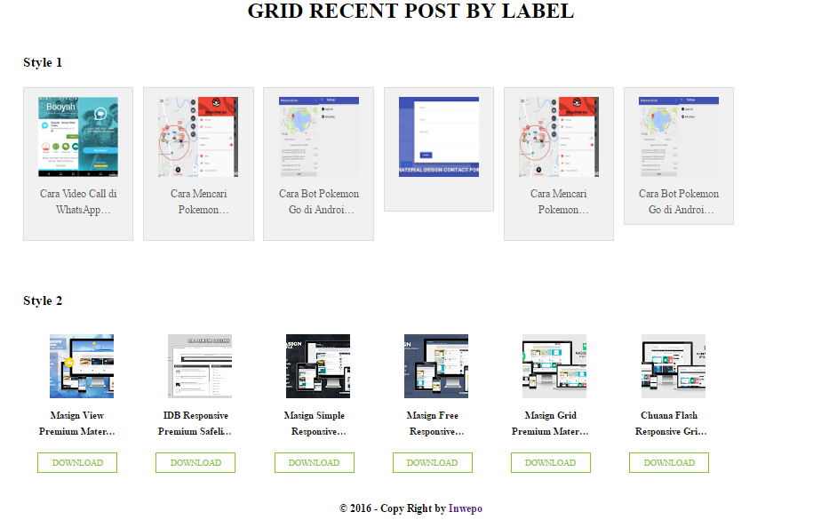Recent Post adalah sebuah widget yang berfungsi menampilkan postingan yang terakhir kita publish atau kita update, biasanya widget ini sering kita lihat pada website yang membahas tentang game, download maupun film. Pada Kesempatan Kali ini saya akan memberikan 2 Tampilan agar sobat inwepo bisa memilih sesuka hati. Tanpa basa basi mari kita ulas widget ini.