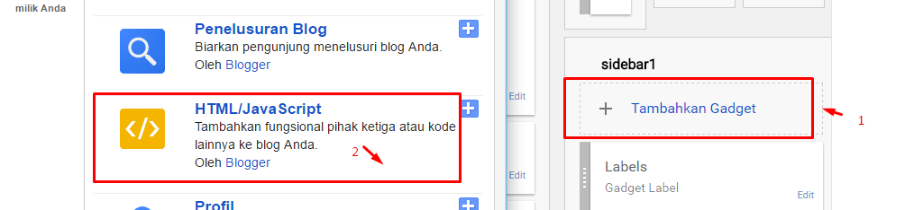 2. Langkah Kedua : Tambahkan atau Edit widget Html/Java Script dan masukan code di bawah: