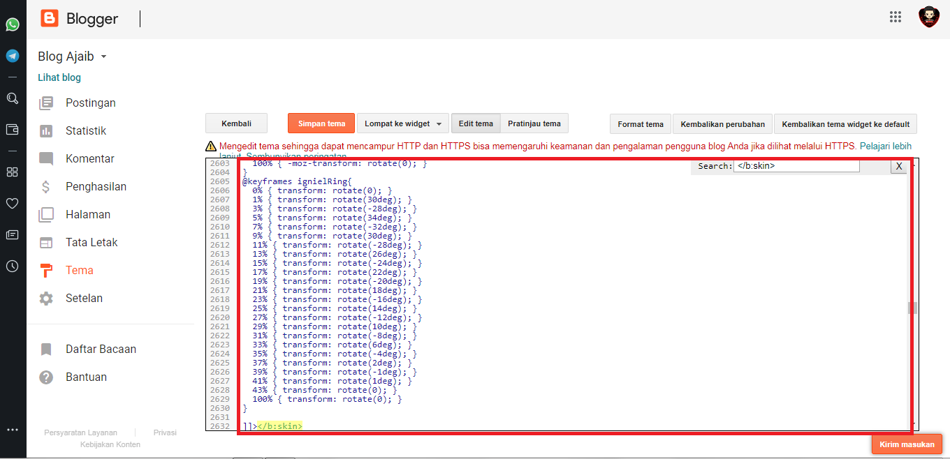 1. Log in ke akun Blogger – Tema – Edit HTML.