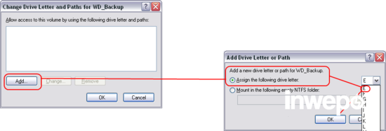8. Klik “Add” kemudian pilih huruf drive dari daftar huruf yang tersedia (jangan menggunakan huruf “A”, “B” atau “C”, tetapi gunakan huruf lainnya yang masih tersedia atau belum terpakai). Kemudian klik “OK”.