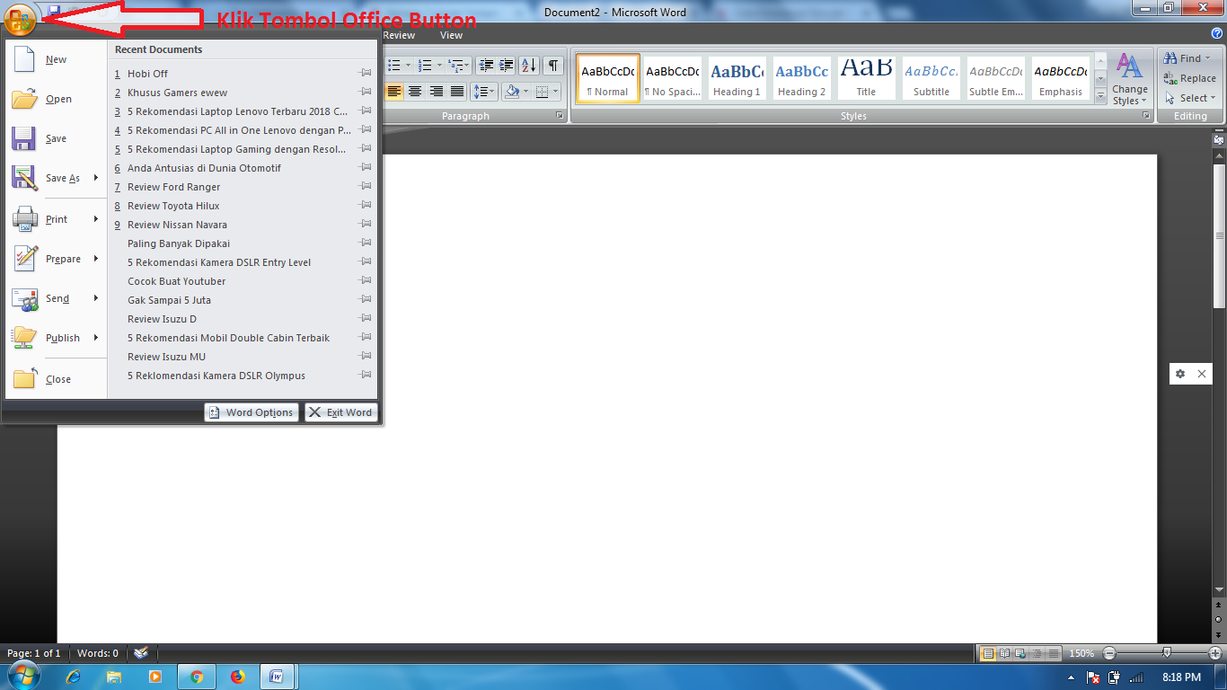 1. Klik tombol Office Button yang terletak di kiri atas halaman kerja Microsoft Word.