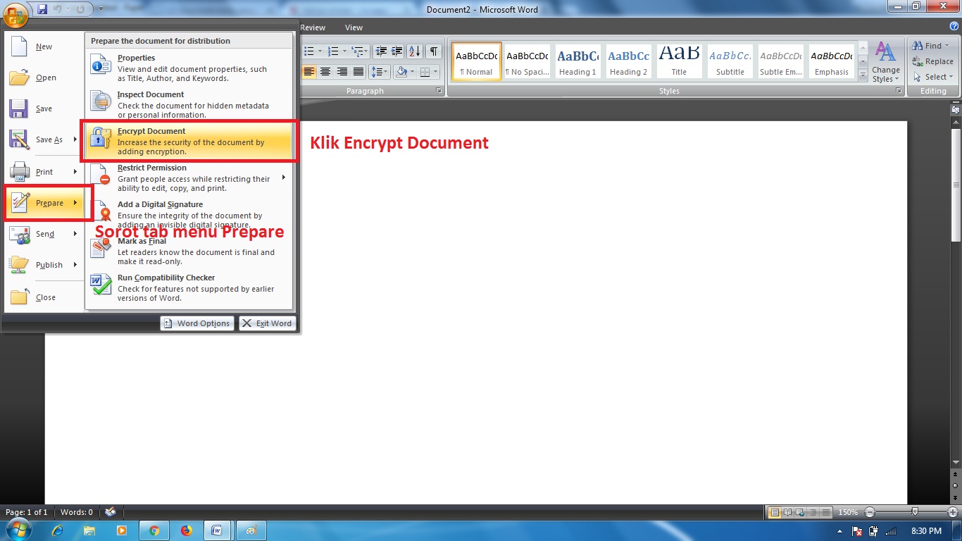 2. Sorot pada sub menu Prepare – setelah itu dilanjutkan dengan melakukan klik pada menu Encrypt Document.