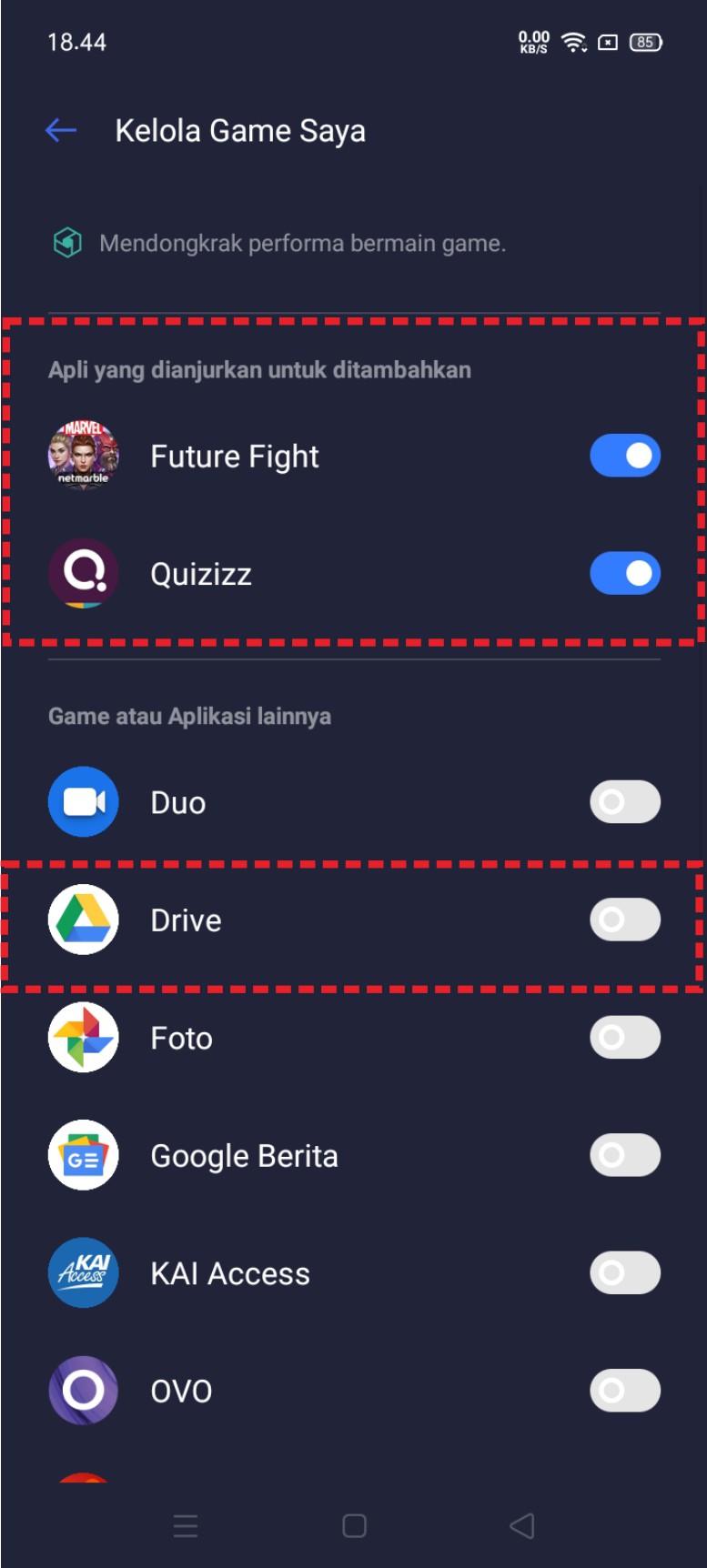 5. Pada menu selanjutnya terdapat dua bagian aplikasi. Kelompok aplikasi di atas merupakan aplikasi yang sudah dihubungkan dengan mode game space. Sehingga ketika aplikasi berjalan, secara otomatis mode game space akan aktif. Sementara untuk kelompok aplikasi di bawah belum dihubungkan dengan mode game space. Disini penulis akan menambahkan aplikasi google drive ke mode game space. Klik tombol bulat yang ada.
