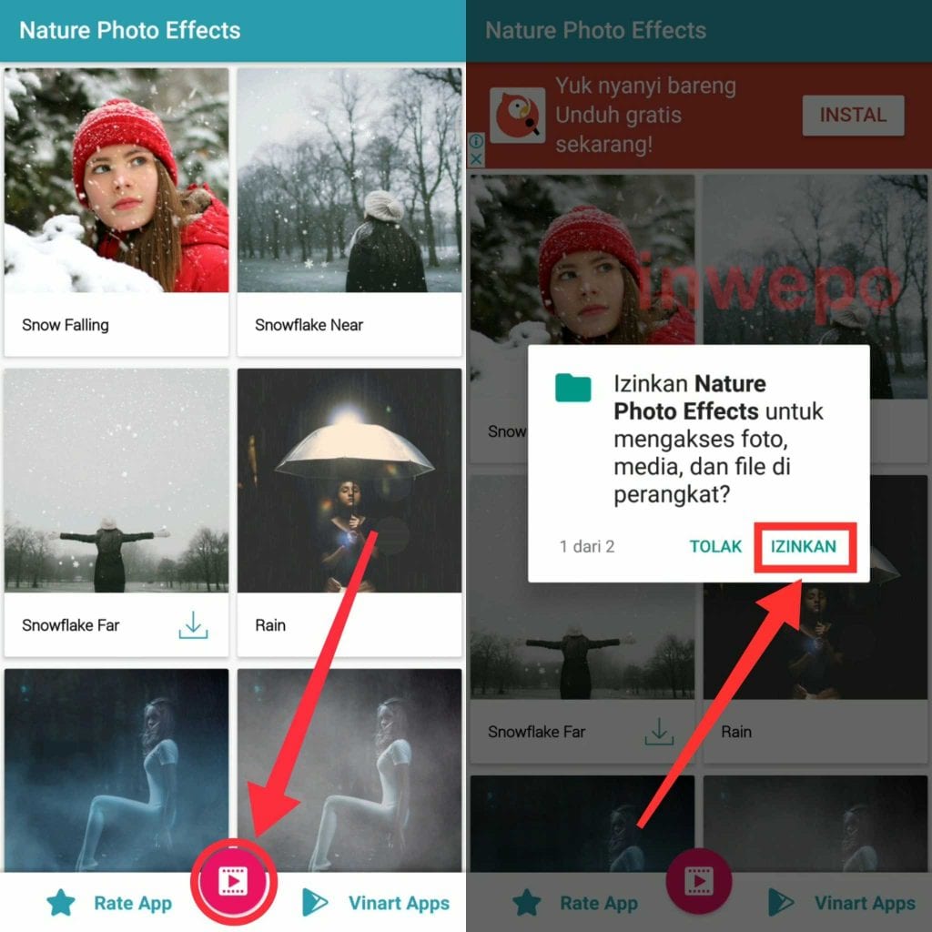 2. Buka aplikasi Nature Photo Effect Maker kemudian langsung tap icon play yang berada di bagian tengah. Lalu tap Izinkan untuk memberi izin akses pada aplikasi.