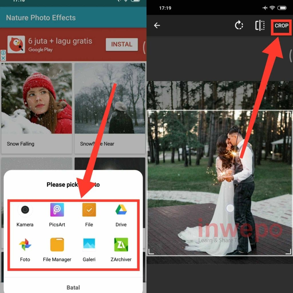 3. Ambil atau pilih gambar dari galeri, bisa juga memotret langsung dengan memilih menu kamera. Selanjutnya sesuaikan photo yang ingin digunakan lalu tap CROP.