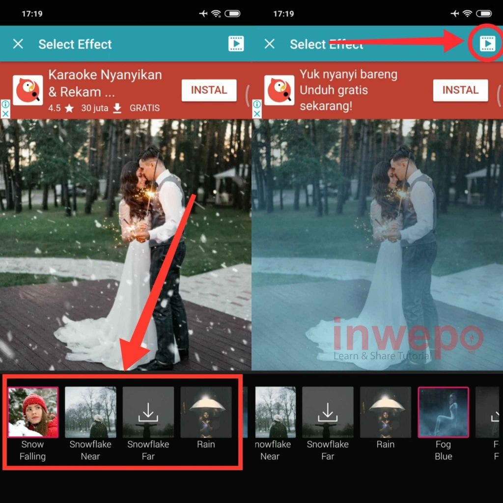 4. Pilih efek animasi yang berada di bagian bawah. Jika belum tersedia silahkan mendownload nya terlebih dahulu. Berikutnya tap tombol play di pojok kanan atas bila sudah selesai memilih efek.