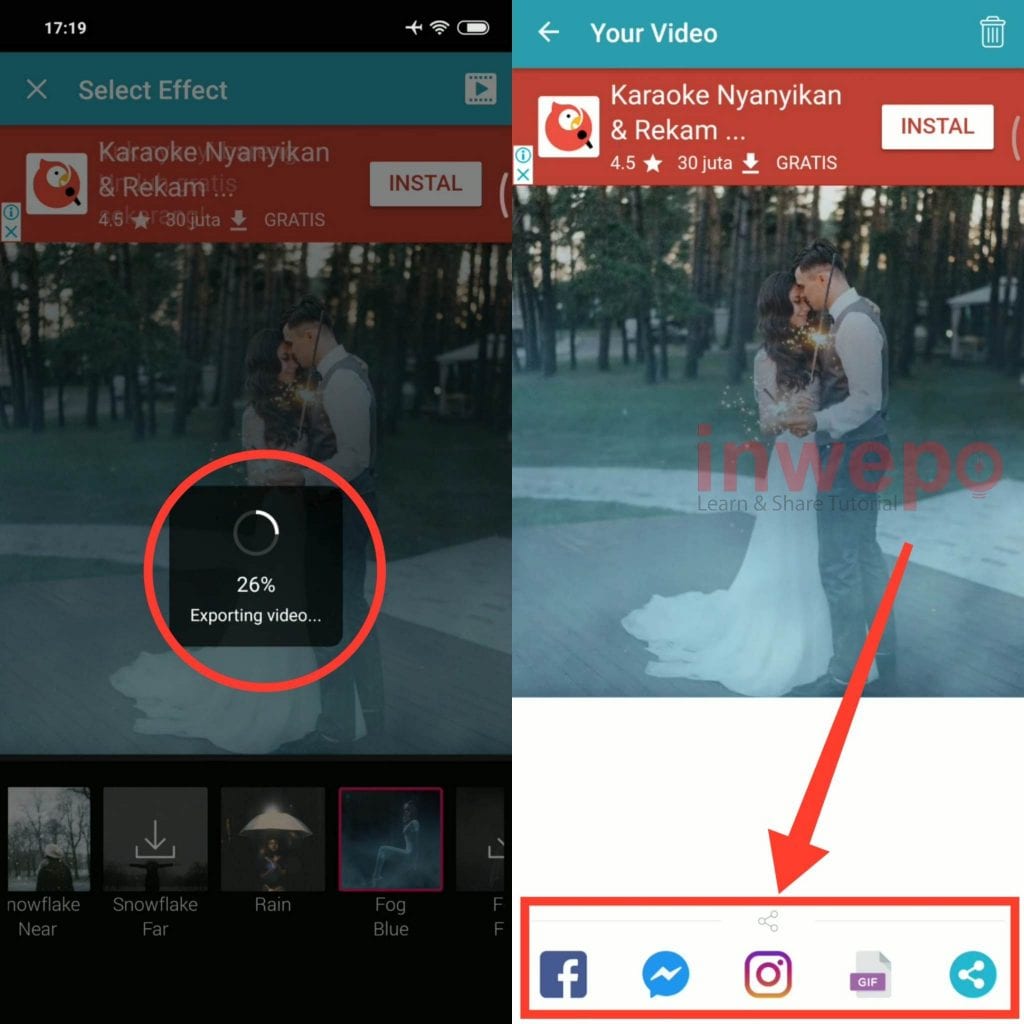 5. Tunggu proses exporting beberapa saat, jika sudah kamu bisa langsung membagikannya ke jejaring media sosial menggunakan menu yang berada di bagian bawah.