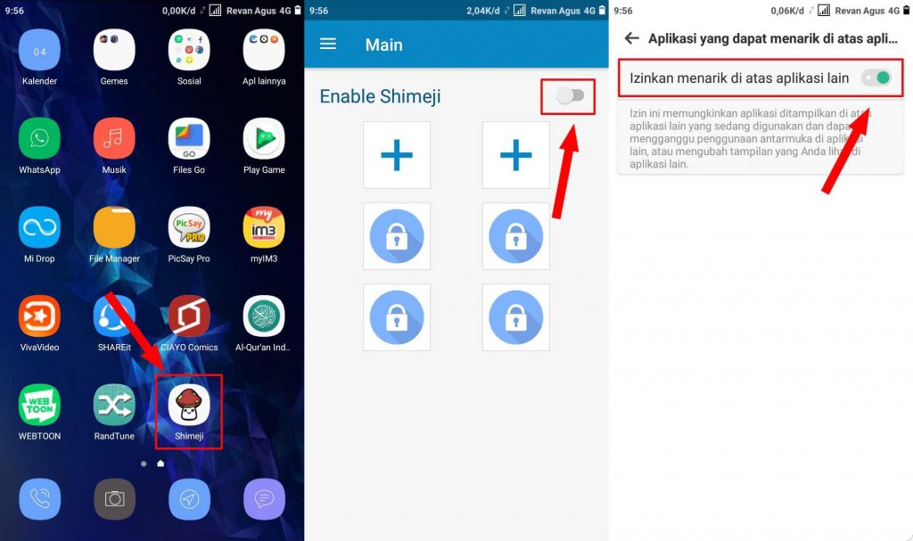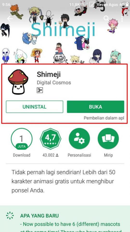 2. Selanjutnya buka aplikasi Shimeji yang sudah terinstall, lalu tap pada tombol di pojok kanan atas. Kemudian Izinkan menarik di atas aplikasi lain.
