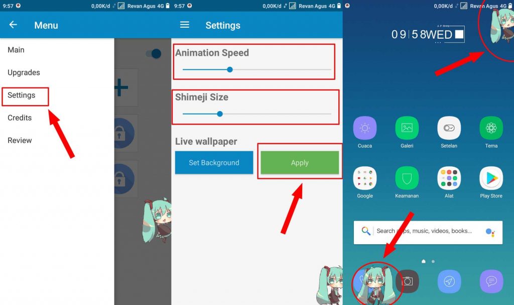 3. Tap pada menu di pojok kiri lalu tap lagi Settings. Gunakan menu Animation Speed untuk mengatur kecepatan dari karakter yang kamu gunakan. Lalu menu Shimeji Size untuk atur ukuran dari karakter kamu terakhir tap Apply.