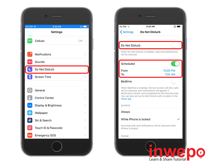 1. Masuk Pengaturan – Gulir ke kebawah ketuk Do Not Disturb – Ketuk Scheduled untuk mengaktifkan fitur Scheduled – Nonaktifkan Do Not Disturb untuk umum – Ketuk pada waktu untuk mengatur jadwal.