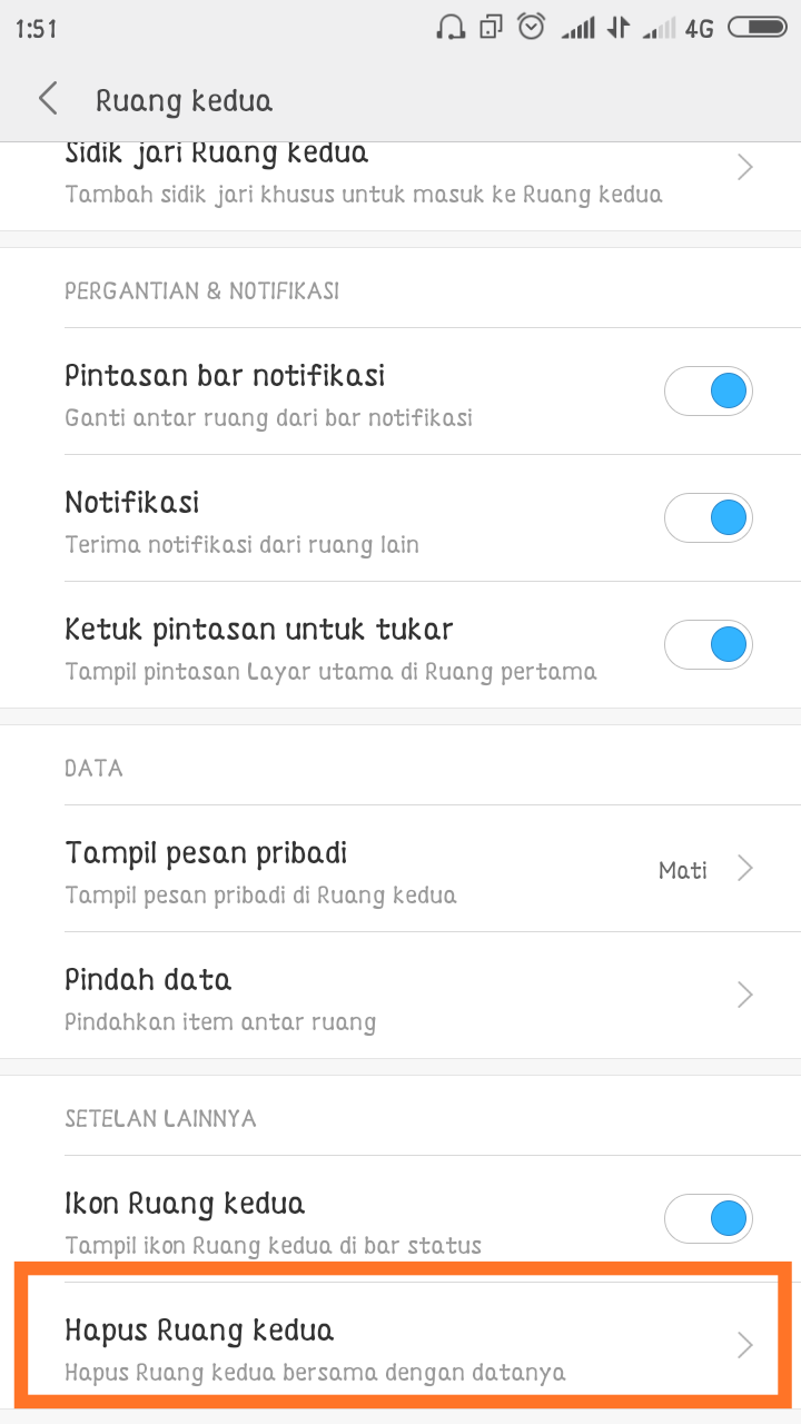 1. Masuk pada Menu Pengaturan (setting) pada ruang kedua ā Ruang Kedua (second space)Ā āĀ scroll ke bawahĀ ā Tap Hapus Ruang Kedua (Delete Second Space).