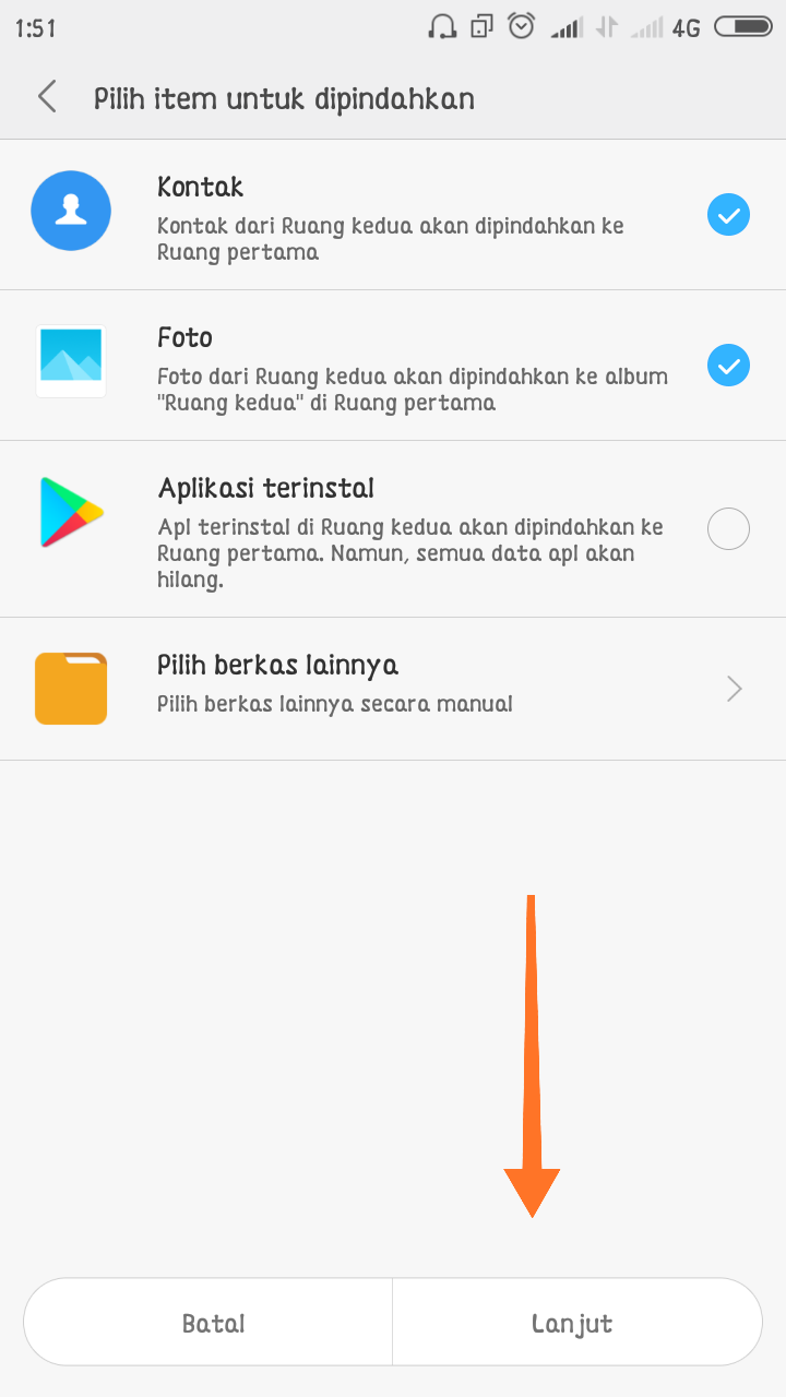 2. Kemudian kamu akan dihadapkan dengan pilihan item mana saja yang akan di pindah dari ruang kedua ke ruang pertama ā Setelah itu Tap Lanjut (continue).